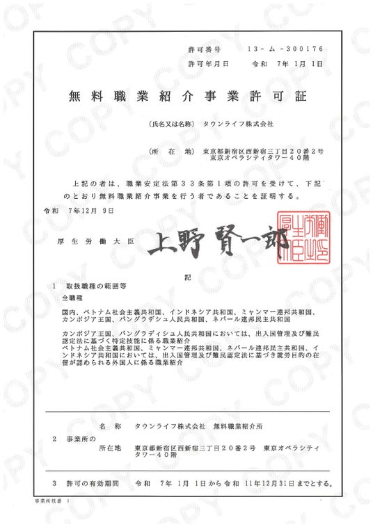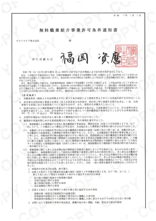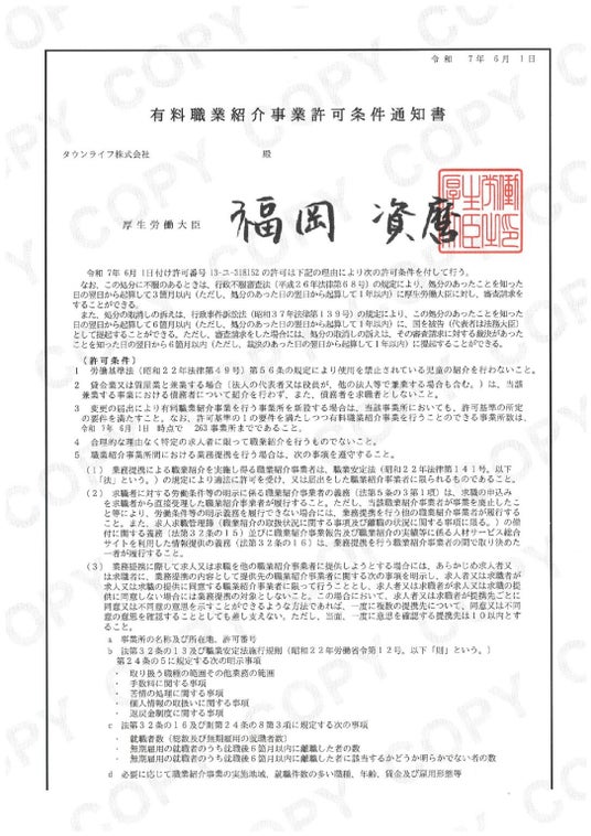 弊社は、2025年1月1日付で「無料職業紹介事業」、2025年6月1日付で厚生労働省より「有料職業紹介事業」の許可を取得いたしました。