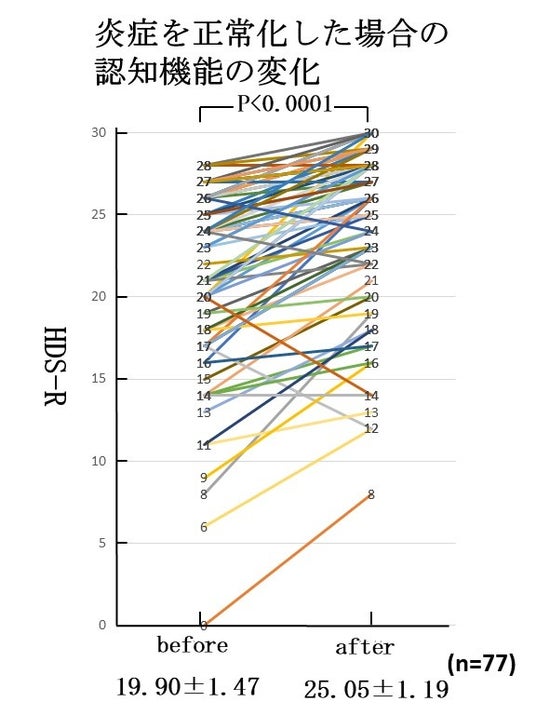 本研究は、炎症を正常化する漢方薬を77例の患者に平均948±248日投与し、その期間中の認知機能をHDS-Rで経過観察したデータを解析したものである(詳細は論文参照)。