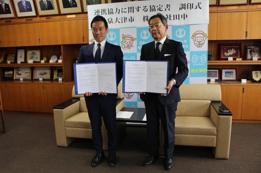 泉大津市役所における調印式 左:南出賢一市長、右:株式会社田中 住吉望社長
