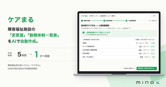 障害福祉領域に特化したAI業務支援システムを開発するMINDX株式会社(本社:東京都渋谷区、代表取締役:石村穂乃香)は、障害福祉サービス事業所向けシステム「ケアまる」の本格提供を開始いたしました。「ケアまる」は、障害福祉の現場で大きな負担となっている変更届・体制届をはじめとする行政提出書類の作成業務をAIで自動化するサービスです。これまで1件あたり平均5時間を要していた作成業務を最短1分に短縮し、就労移行支援・就労継続支援A型/B型など各種事業所の事務負担を大幅に削減します。