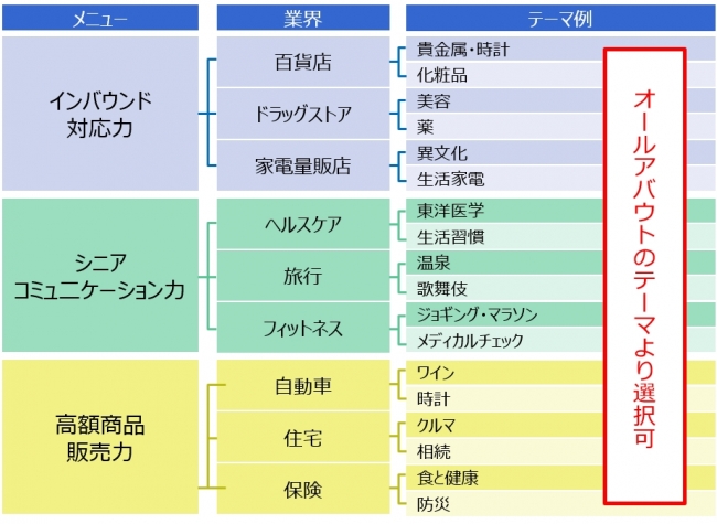 本研修プログラムでは、「インバウンド対応力」「シニアコミュニケーション力」「高額商品販売力」の3つのメニューを用意し、顧客との商談プロセスで各メニューの専門知識が求められる業界に向けてサービスを提供します。企業が自社の営業担当者に身につけさせたい知識やスキルに合わせて、「All About」の約1,300のテーマから最適なテーマや専門家を提案します。