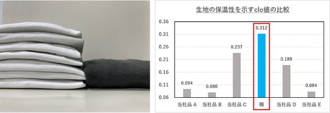 保温性を表すclo値(クロ―値)は、一般的なコットンインナー7枚を重ね着した場合0.293のところ、HOTMAGIC【極】では0.312という結果がでており、7枚分以上の保温力があることがわかります。