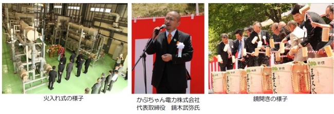その後、鏡割りと点火式が行われ、鏑木社長と中島副県知事により点火スイッチが押され、かぶちゃん村森の発電所が無事稼働開始いたしました。