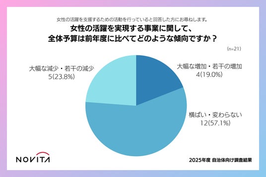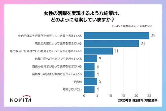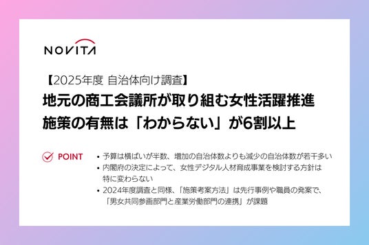 WebやICTを活用し、多様な働き方の実現を支援する地域共創事業などを行う株式会社ノヴィータ(所在地:東京都渋谷区、代表取締役:三好怜子、以下ノヴィータ、https://www.novitanet.com/ )は、全国の45自治体に向け、女性活躍支援や、男女共同参画の取り組みについて調査を実施しました。