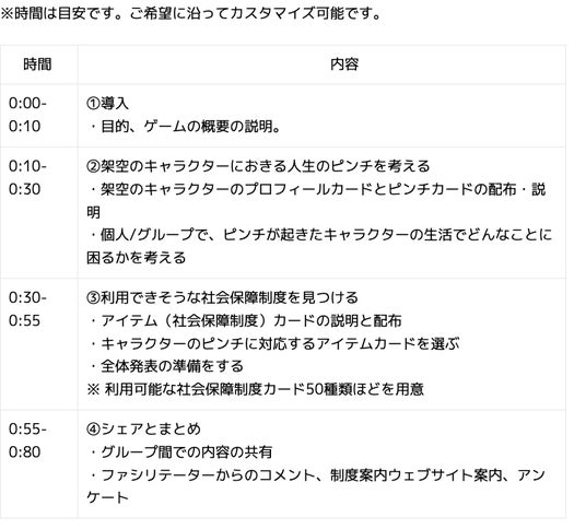 そこでNPO法人Social Change Agencyでは、主に中学生や高校生を対象に、架空のキャラクターに起きたピンチを題材にして、さまざまな出来事に対して利用できる制度を知ることを目的にしたゲームを開発しました。現在、テスト版を体験いただける学校等を5カ所限定で募集しております。【2024年10月末】までは、ファシリテーター交通費実費分のみで、テスト版の提供が可能です。以下本ページ最下部より、お気軽にお問い合わせください。