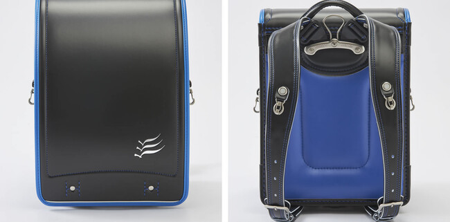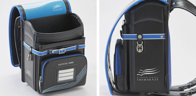 「観光特急しまかぜコラボランドセル カザマランドセル×近鉄電車」は人気のブラックを基調に、三重県・伊勢志摩地域の晴れやかな空をイメージした観光特急「しまかぜ」のブルーをあしらうことで、全体的に引き締まったカラーリングとなっています。
