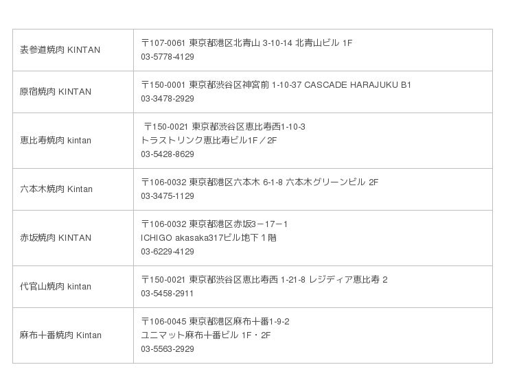 表参道焼肉 KINTAN、原宿焼肉 KINTAN、恵比寿焼肉 kintan、六本木焼肉 Kintan、代官山焼肉 kintan、赤坂焼肉 KINTAN、麻布十番焼肉 Kintan