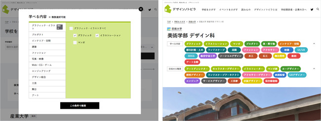 デザイン・クリエイティブの領域を12のカテゴリ(※)に分類した『12ノトビラ』を設定し、情報をデザイン視点で整理。学校種別、地域や国公私立のほか、12ノトビラと各学校のカリキュラムを照らし合わせて「学べる内容」「目指せる職業」としてタグを付け、検索可能にしました。各カテゴリを知り、学びとその先にある将来をイメージすることで、より自分に合った進学先を探すことができます。