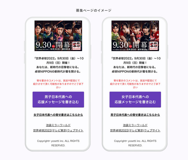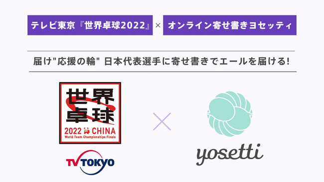 株式会社yosetti(東京都品川区、代表取締役:岡田 昇三)が運営するオンライン寄せ書き「ヨセッティ (yosetti.com)」と、テレビ東京系・BSテレ東にて9月30日~連日放送/配信を予定している『世界卓球2022』は初のコラボレーションを行います。本企画では、4年ぶりとなる団体戦に挑む日本代表の選手たちに向け、オンライン寄せ書き「ヨセッティ」の機能を活用し応援メッセージをお届けします。