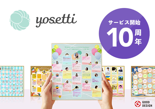 オンライン寄せ書きヨセッティ(yosetti.com)は2012年からサービス提供を開始し、今年で10周年を迎えます。会員数約200万人、累計約65万件の寄せ書き作成実績を誇り、様々な贈答シーン等でご利用いただいています。人気キャラクターとのコラボレーションなども含む200種類以上の豊富なデザインと、高品質な色紙印刷を最短で翌日に納品できるユーザー体験の良さが特徴です。