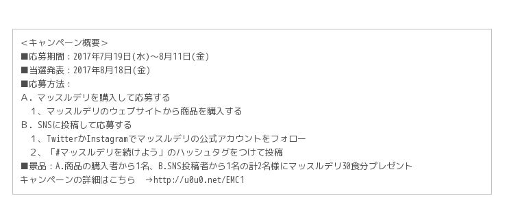 Muscle Deliは、定期購入サービスの開始に伴い、より多くのお客様に商品の効果を実感していただけるよう、「#マッスルデリを続けようキャンペーン」と題し、抽選で商品を購入いただいたお客様の中から1名、SNS(InstagramかTwitter)で投稿してくださったお客様の中から1名の計2名様にMuscle Deliのお食事30食分をプレゼントするキャンペーンを行います。