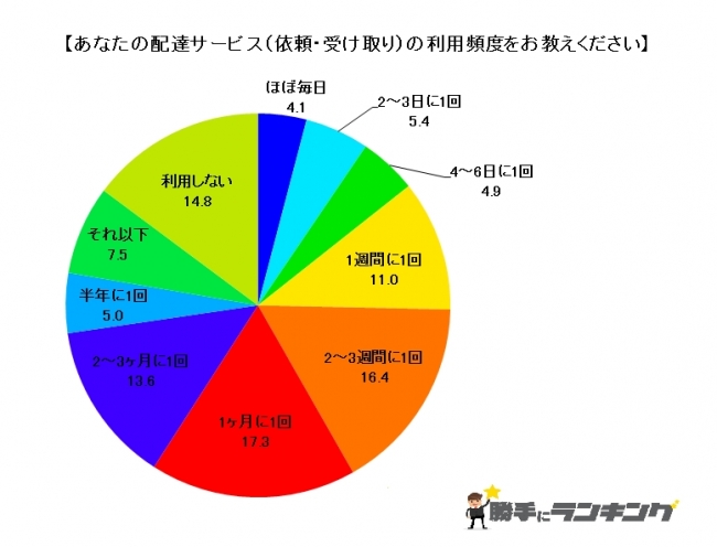 宅配を利用しないという方も中にはいますが、最も多い回答だったのは17.3%で「1ヶ月に1回」利用するでした。