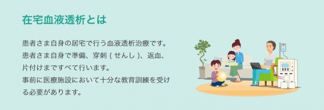患者さま自身の居宅で行う血液透析治療です。患者さま自身で準備、穿刺(せんし)、返血、片付けまですべて行います。事前に医療施設において十分な教育訓練を受ける必要があります。