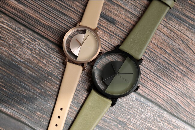 ユニークなスケルトン文字盤に、32mmのシャンパンゴールドケースは手元に馴染みやすいベージュ文字盤/40mmのブラックケースは落ち着いた発色のオリーブ文字盤と、アースカラーの色合わせが絶妙にマッチ。
