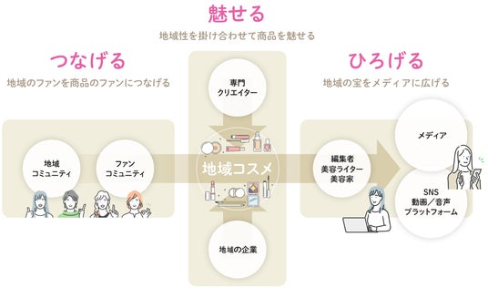 同プロジェクトでは、素晴らしい商品であるのに知名度が上がらない、全国各地に眠る地域コスメの魅力を、デジタルとアナログを融合させ『つなげる・魅せる・ひろげる』の3つのコミュニケーションで印象的に伝えていきます。化粧品を通じ、人の毎日をより豊かにすることを目指した本プロジェクトにより、商品はもとより、地域の文化、地域の歴史への共感をも促し、人も地方も元気にする一助になればと考えています。