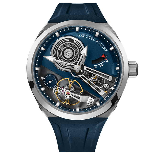 チタンと合成サファイアクリスタル、立体ジオメトリ形状のベゼル、カーブした合成サファイアクリスタルのシースルーケースバック、“Balancier Incline”と“Greubel Forsey”の刻印