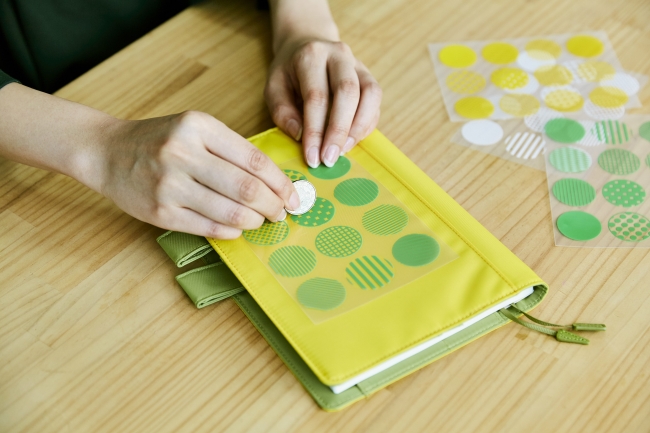 ・布製ペンケースや手帳カバーにコインでこすって貼れるシールです。