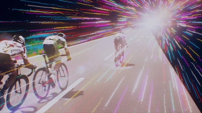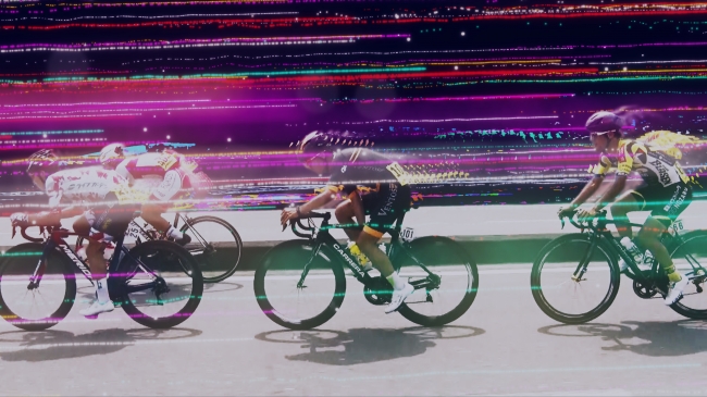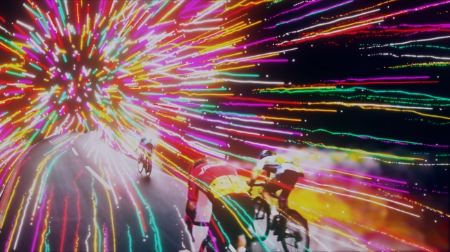 荒れ狂う海の中、轟音とともに海が割れ、海底(道)が現れます。その道から、自転車の集団がレインボーの光をまとって通り抜けていき、その光をまとったまま、選手たちが勢いよくコースを走っていく様子が映し出されます。選手たちの走りから発生したさまざまな色の光がJBCFのロゴ一点に集まり、最後に「JBCF CYCLE ROAD SERIES」の文字が映し出されます。