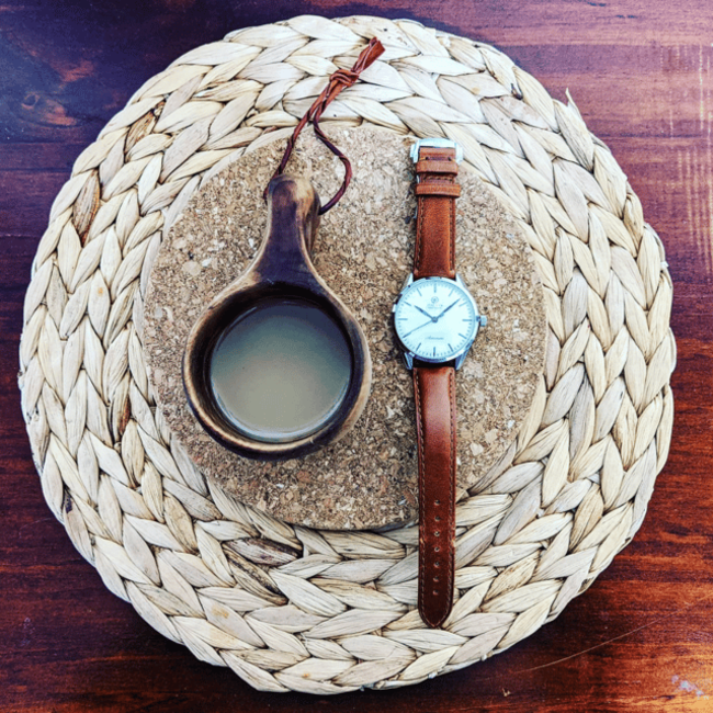 ストラップには、高価で耐久性と通気性に優れているFull-grain leather(フルグレインレザー)を使用。使い込むほどの美しさを増す高級感のある色艶が特徴で、この革を使った小物を使うことにより高級感が生まれ「一流の男性の装い」に近づきます。別名 "ベジタブルタンニン" とも呼ばれ、環境にも優しくサスティナブルな一面も持ち合わせています。