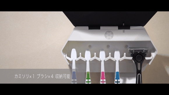 USBによる充電式。歯ブラシ4本+ひげ剃り1本+歯磨き粉2本が収納可能な壁掛けタイプ。