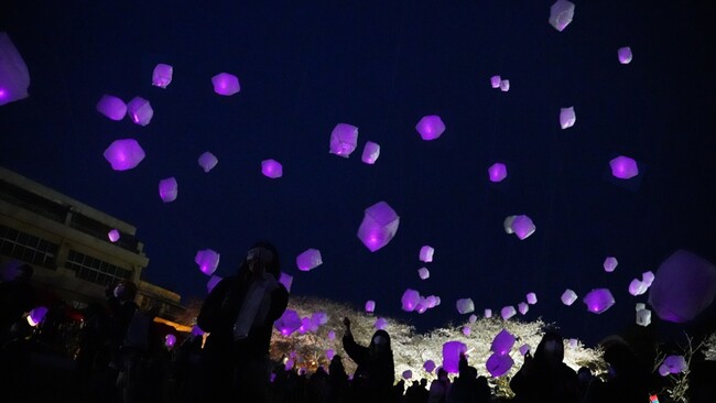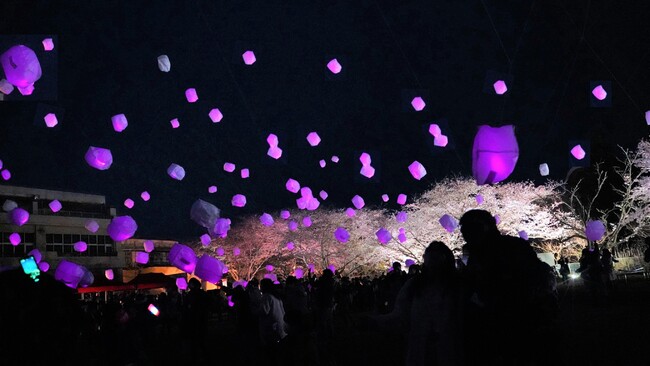 夜桜をバックに桜色のランタンが灯る「おいも夜桜スカイランタンフェスティバル」