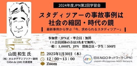 日比NGOネットワーク(略称 JPN、運営委員会代表:横田宗)は、1月30日(木)の12時から2024年度JPN第2回学習会 スタディツアーの事故事例は、社会の縮図、時代の鏡 最新事例から学ぶ「今、求められるスタディツアー」を開催します。【詳細・お申込:https://jpngakushukai2-20250130.peatix.com/ 】