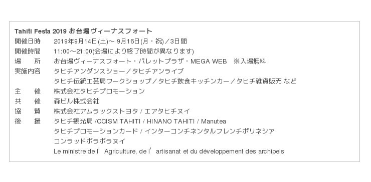 様々な個性を持つ施設が集まった複合型施設お台場パレットタウンは、2019年9月14日(土)~16日(月・祝)の3日間、「Tahiti Festa 2019 お台場ヴィーナスフォート」(共催:森ビル株式会社)と題した“オンリータヒチ”のイベントを、お台場ヴィーナスフォート、パレットプラザ、MEGA WEBにて開催します。