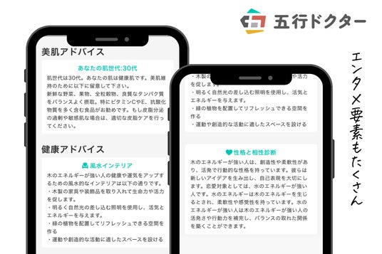 体調やお肌の改善のためのアドバイス機能では、五行解析によって得られた「木、火,土、金、水」の五つのエネルギー値を解析して、「今日のおすすめ料理」、「おすすめ運動」、「運気アップの行動」、「性格と相性診断」など12種類のアドバイスを提示します。