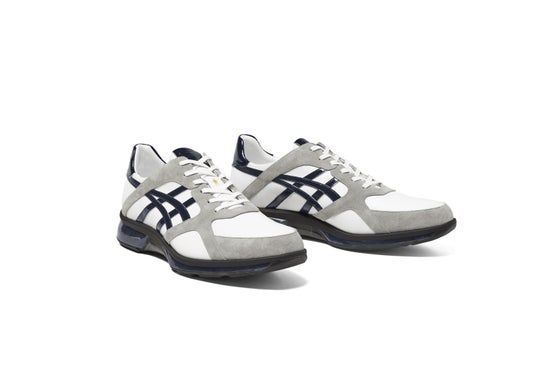 アッパー(甲被)はホワイトをベースに、きめ細かい肌目が特徴のフランス産原皮のキップレザーを使用しています。つま先部分やアイレットステイ(靴ひもの通し孔周りを補強するパーツ)はグレーで、質感のあるベロアレザーを施しています。アシックスのアイコンであるアシックスストライプ部分は深みのあるブルーまたはレッドとし、エナメル素材を使用しています。複数の素材とカラーを組み合わせることで、上品でドレッシーな「CORTHAY」の世界観を表現しています。