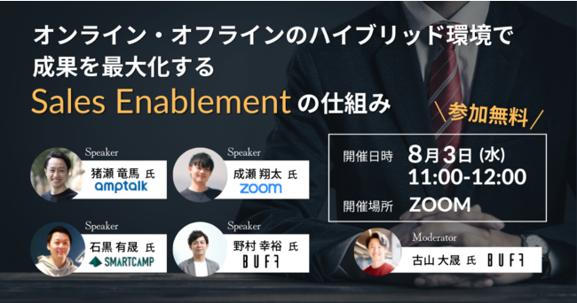 営業組織向けSaaS「SALESCORE(セールスコア)」および営業組織向けプログラムを展開する株式会社Buff(バフ、本社:東京都渋谷区、代表取締役社長:中内崇人、以下「当社」)は8月3日(水)11:00~にamptalk株式会社、スマートキャンプ株式会社およびZVC Japan株式会社 (Zoom) と共催で「オンライン・オフラインのハイブリッド環境で成果を最大化するSalesEnablementの仕組み」ウェビナーを開催いたします。