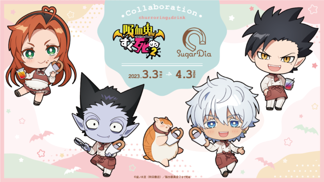 コラボ開催期間中、『SugarDia 原宿』では、TVアニメ『吸血鬼すぐ死ぬ2』のキャラクターをイメージしたコラボチュロリングやドリンク、コラボグッズの販売を予定しています。