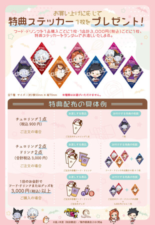 ・コラボメニュー1点ご購入につき1枚、及びお会計3,000円(税込)ごとに1枚、特典ステッカー(全7種)をランダムでプレゼントいたします。
