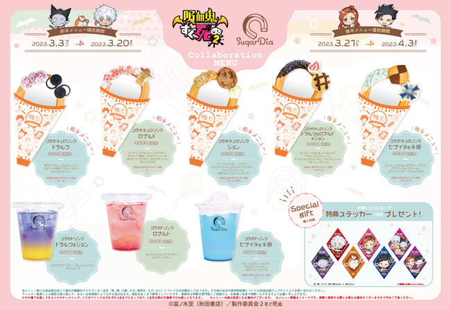 開催期間中、ハッシュタグ #吸血鬼すぐ死ぬ2 #SugarDia と一緒にコラボメニューの写真をSNSに投稿し店頭でご提示いただくと、コラボメニューご注文特典のステッカー(全7種)をランダムでもう1枚プレゼントいたします。