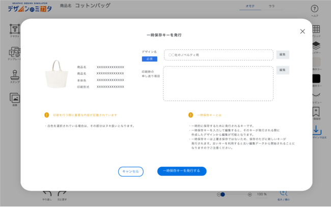保存したデータを呼び出してデザインを再開できるほか、デザインキーを渡すと別のユーザーがデータを編集・更新できます。