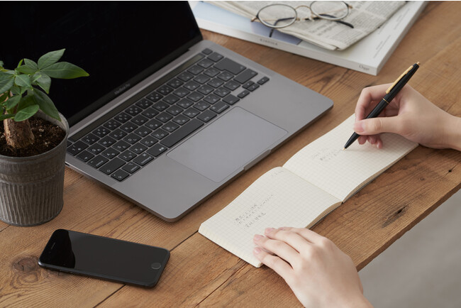 リモートワークやオンライン会議の機会が増える中、既存の縦型ノートでは机の奥行が足りず難儀することが多い。しかしこのノートはコンパクトな横長型で、ページ数も豊富なためしっかりと書き込める点が魅力である。