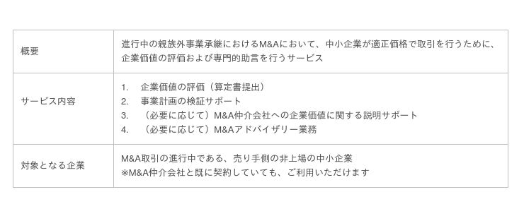 中小企業のM&A=主に親族外事業承継において、M&A仲介会社による不適正な価格での取引が横行していることを受け、不当な取引を減らし株主や企業の利益を守るため、「親族外事業承継向け M&A企業価値評価サービス」を開始しました。