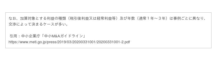 また、M&A仲介会社による株価計算は、純資産+営業利益の数倍(1~3倍)という非常に簡略的な計算方法がスタンダードとなっています。この方法は価値評価の手法として理論的ではなく、中小企業庁「中小M&Aガイドライン」における算定方法の項目でも、株式価値の評価手法としてではなく参考情報としてのみ記載されているにすぎません。