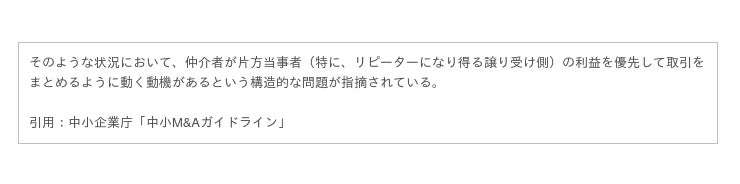 これは上述の仲介取引の利益相反構造にも起因すると考えられており、中小企業庁「中小M&Aガイドライン」では以下のように記載されています。