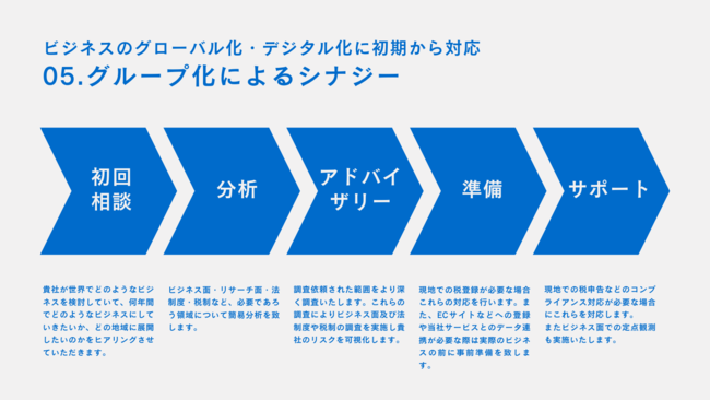 グローバルビジネスにおいては、フィジビリティスタディの段階で現地税制調査と現地ビジネス調査はセットで進めることが多く、今回のグループ化によりお客様側でもより複合的にご質問頂ける体制になりました。