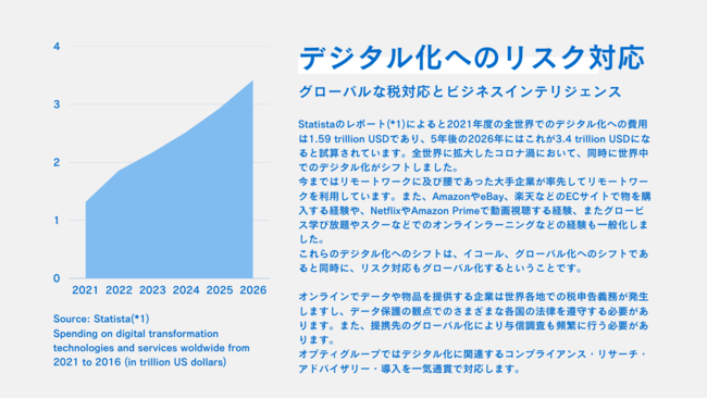 これらのデジタル化へのシフトは、イコール、グローバル化へのシフトであると同時に、リスク対応もグローバル化するということです。オンラインでデータや物品を提供する企業は世界各地での税申告義務が発生しますし、データ保護の観点でのさまざまな各国の法律を遵守する必要があります。また、提携先のグローバル化により与信調査も頻繁に行う必要があります。オプティグループではデジタル化に関連するコンプライアンス・リサーチ・アドバイザリー・導入を一気通貫で対応します。