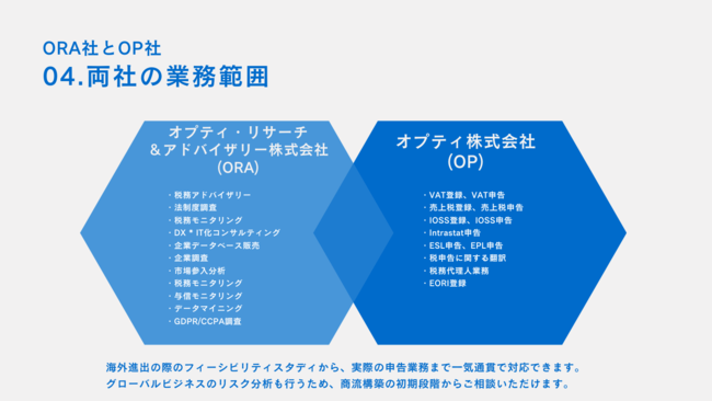 これにより、掲社は越境ECやデジタルに関連する世界各地の税申告を支援するオプティ株式会社(本社:東京都千代田区、代表取締役:淵上 暁、以下オプティ社)のグループ会社となり、税務アドバイザリー、市場調査、産業分析、税務コンプライアンス、デジタル化関連ツールの他、税務エンジン(VATCalc, Avalara)や外国企業データベース(D&B Hoovers)導入等、一気通貫でのクライアント企業のグローバル化、デジタル化を進められる体制となりました。