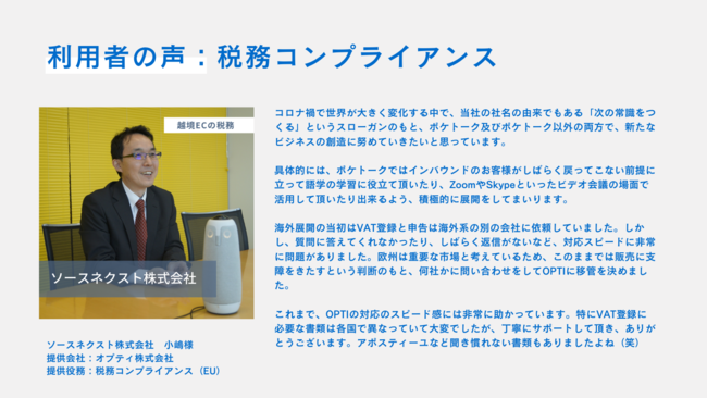 オプティは欧州VATや米国売上税を中心として世界各地での間接税申告を代行するファームです。また、各種タックスアドバイスも実施しており、延べ1000社以上の企業と取引があります。越境ECでのVAT申告は2010年の創業以来実施し、国内でも最も経験を有しており、税務だけでなくAmazon、eBay、Rakuten等のプラットフォーム利用時の越境ECの税制の他、Shopify、WooCommerce、BASE、STORESの越境ECの税制についても熟知しており、越境ECの実情も踏まえた税務アドバイスが出来る点が特徴です。また、「日本一社員が成長できる会社」をモットーに働きがいのある会社を目指しています。