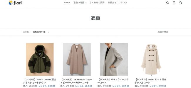< 「flarii」のトップ画面と、一レンタル旅行用品・商品カテゴリー「衣類」画面 >