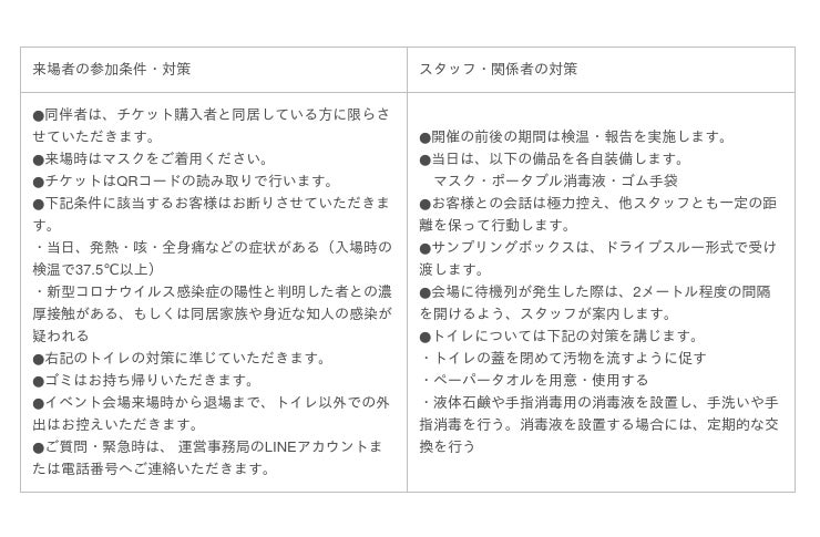 当イベントでは、今後も同様のイベントを継続的に各地で開催できることを目指して、イベントに参加される来場者とスタッフ・関係者の安全に配慮し運営して参りますので、何卒ご理解の程、よろしくお願い申し上げます。
