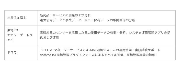 具体的には、東電PG、エナジーゲートウェイは高精度電力センサーを活用し電力使用データの収集・分析※3・アプリの提供を行い、ドコモはモバイル回線の提供に加え、「ドコモIoTマネージドサービス」※4を活用した実証試験の運用管理を行います。また、三井住友海上は収集・分析した電力使用データと保有する事故データやドコモ保有データとの相関関係を分析し、保険料の割引や補償範囲の拡大を含めた新商品の検討を行います。