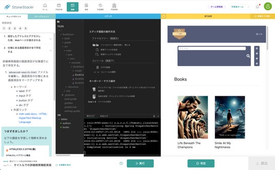 学習コンテンツとして「Java」「Spring Framework」「HTML / CSS」「JavaScript」「SQL」が用意されており、学習者はブラウザ上で課題のコーディングを行いながら、必要な知識を学んでいきます。