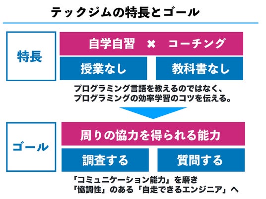 テックジムでは、座学なしでプログラミングスキルを習得します。「自習学習 × コーチング」を特徴としており、プログラミング言語を教えるのではなく、プログラミングの効率学習のコツを伝えます。