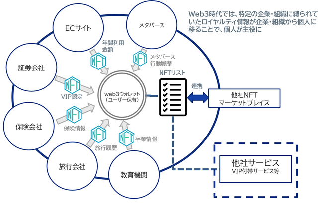 企業がWeb3時代に対応することで、特定の企業や組織に縛られていたロイヤルカスタマーの情報が個人に帰属し、企業や組織の垣根を超えて活用することができ、複数の企業や組織間で共有されたロイヤルカスタマーの情報に基づいて、サービスを展開することが可能になります。