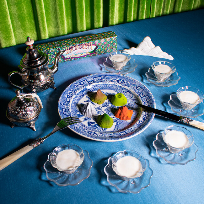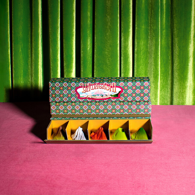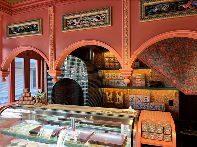 “桃源郷の土産物屋” をイメージした異国情緒あふれる店内。日本古来の雛文化に着目したジオラマのようなチョコレート菓子「山菓子」を中心に、オリジナルの「おこし」など和洋折衷のお菓子と、台湾茶や2種のショコラショーなど、こだわりのドリンクを販売いたします。テイクアウトの他、併設するティーサロンでのイートインもお楽しみいただけます。