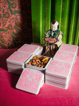 オリジナルのおこしが入ったお菓子缶です。小楽園キッチンで丁寧にひとつひとつ制作している、みたらし風味の甘しょっぱいカリカリが癖になる「小楽園のおこし」と、黒胡麻をまぶした香ばしい3 種 のキャラメリゼナッツ。柚子胡椒風味のかりんとうに梅とニッキと抹茶の味の 金平糖を詰め合わせました。